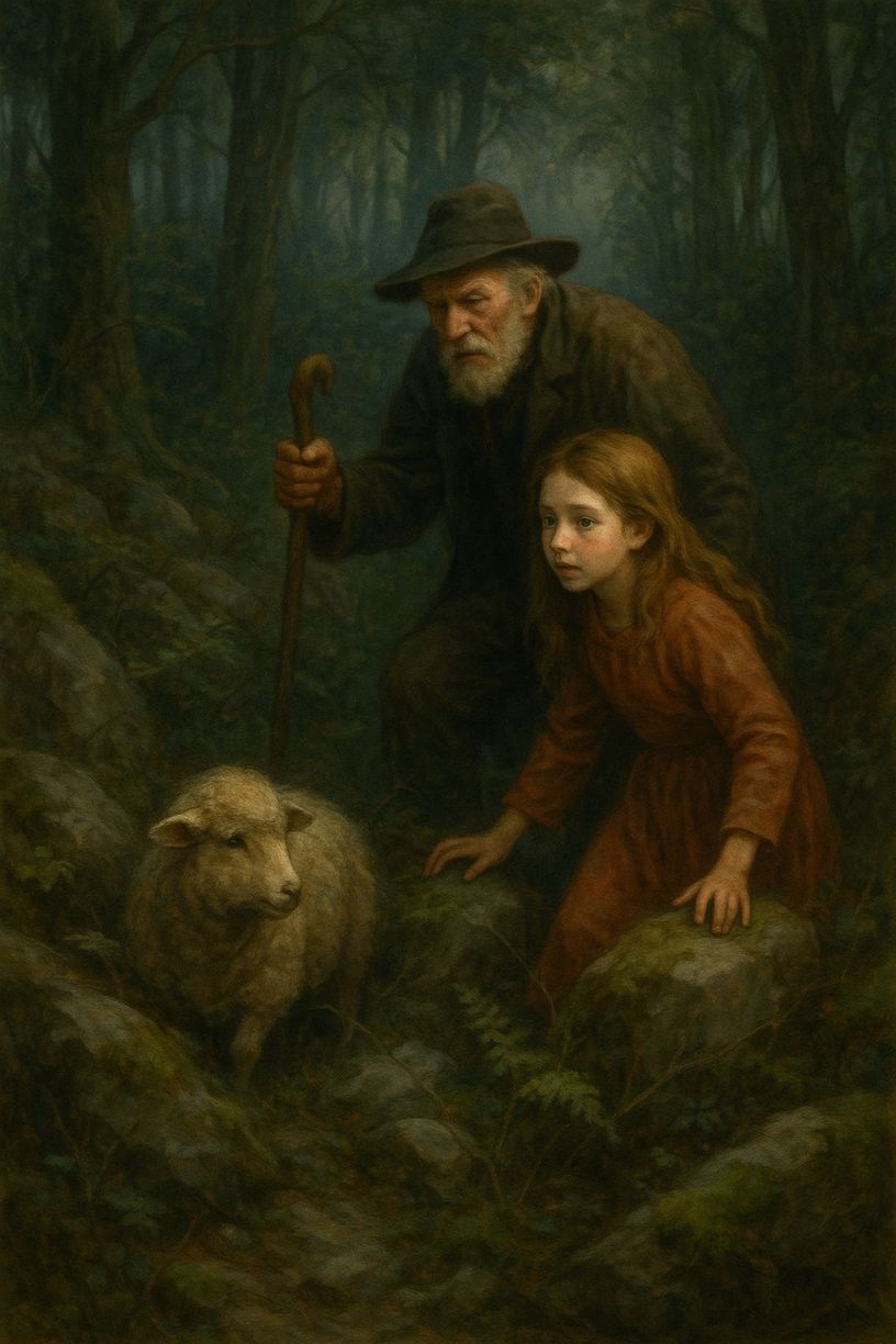 -«iVaya!» -exclamó- «Tú eres la niña que estuvo jugando con el corderito huérfano hace unos días, y mira por dónde te presentas en el momento oportuno. Uno de los traviesos corderitos se ha extraviado y mucho me temo que se haya quedado enzarzado en alguna espesura de la que no sea capaz de salir, pero ni le veo ni le oigo. Tú puedes ayudarme a buscarle?»
